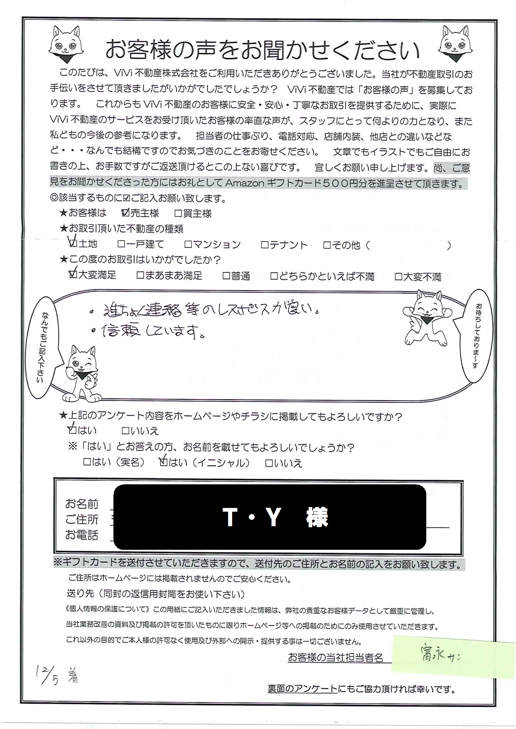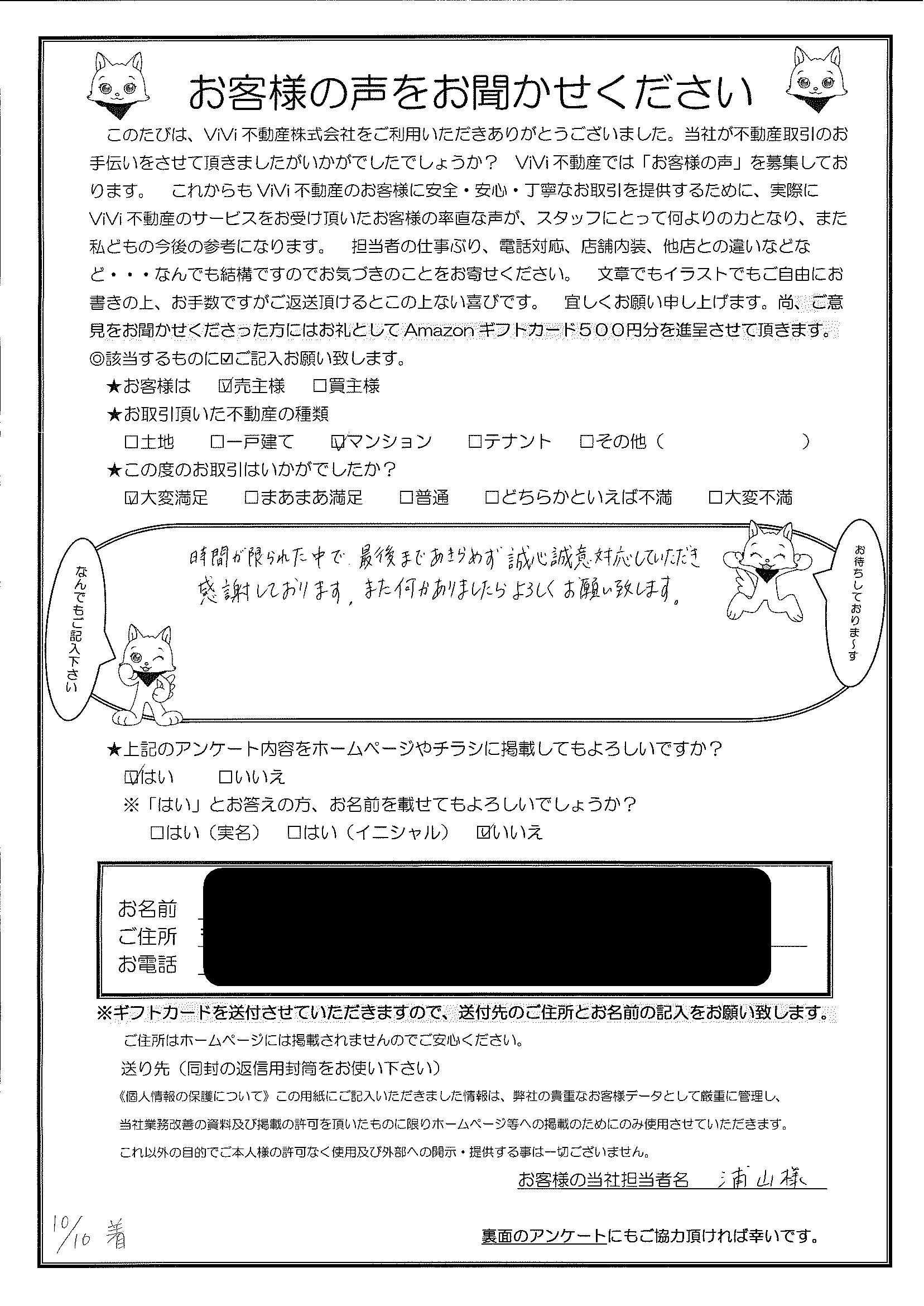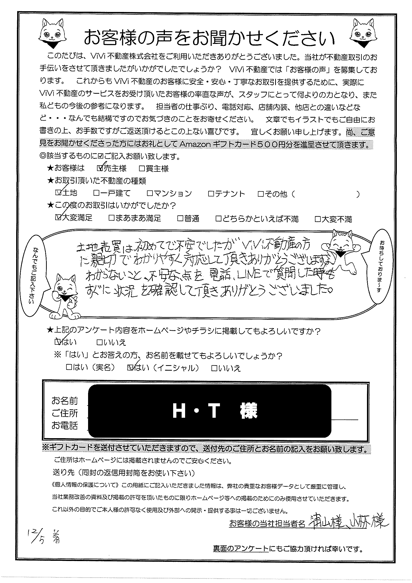 I様、このたびは大切なご自宅のご売却をお任せいただき、誠にありがとうございました。