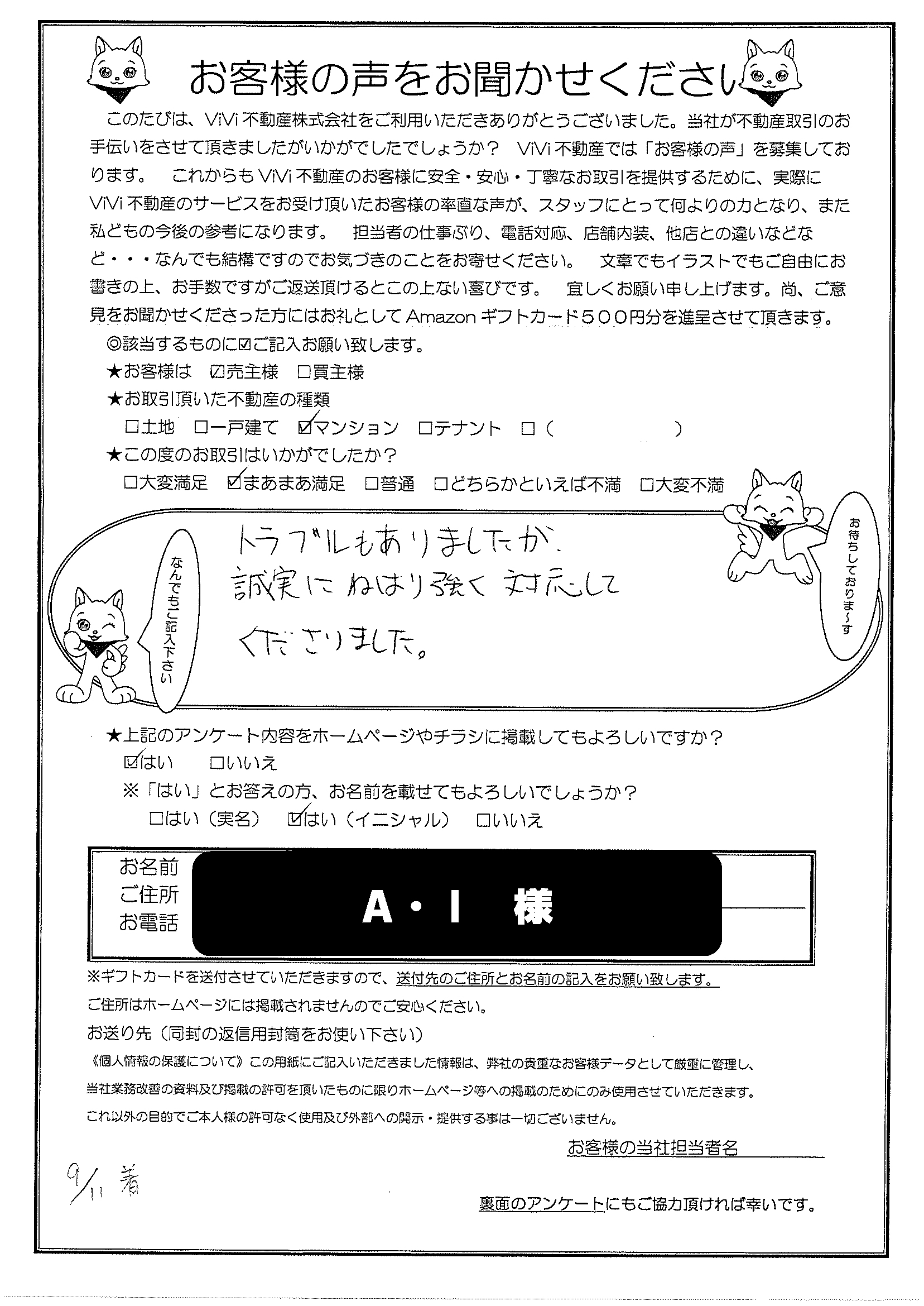 また、お引渡し後の電気契約に関する清算ではご迷惑をおかけいたしましたが、I様のご理解とご協力により、円滑に対応を進めることができました。改めて感謝申し上げます。